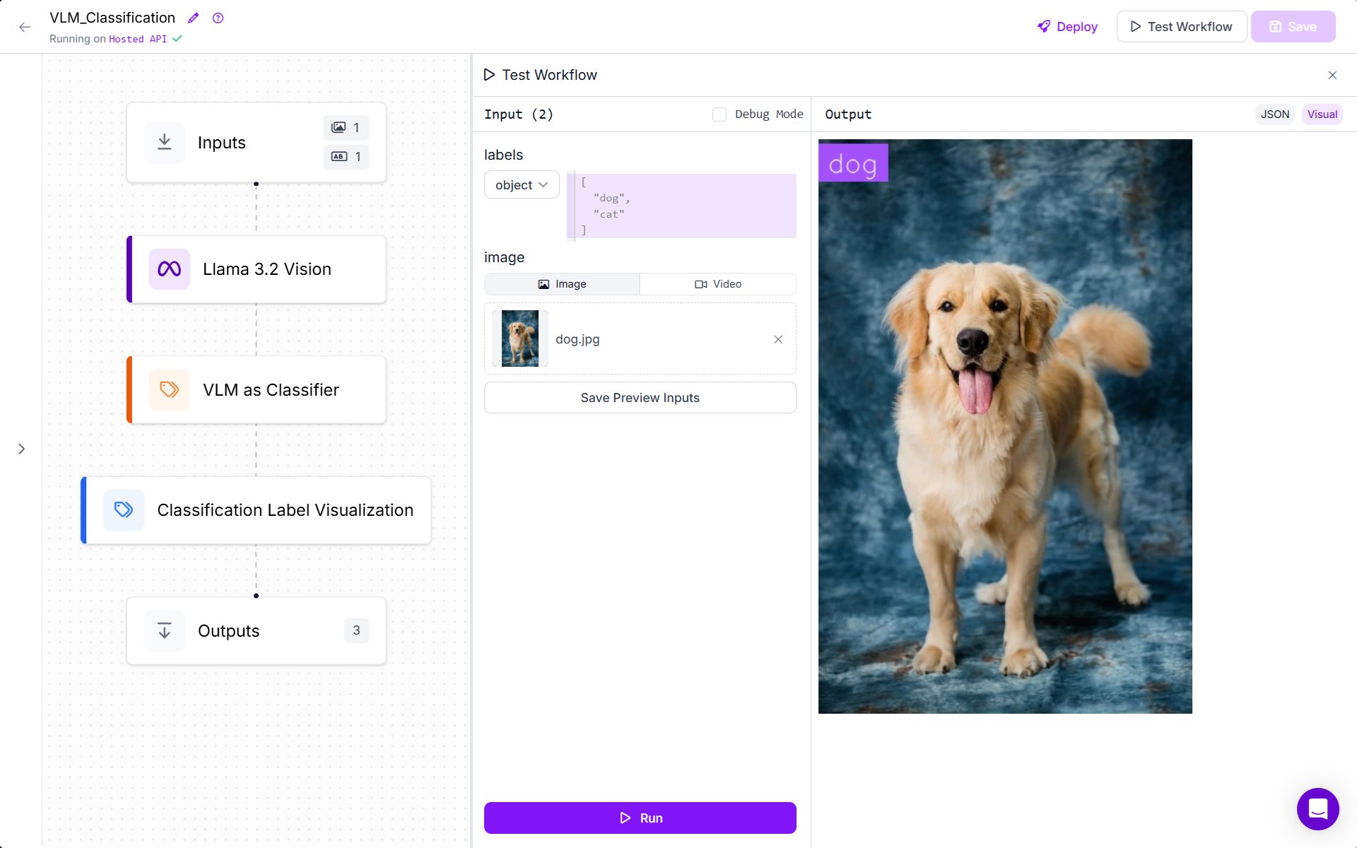 Here is the output after running Workflow. I have uploaded image of a “dog” and it was classified as “dog” with high confidence. You can try with any other image and specifying the new class labels. In the output from this Workflow, you will see image with classification label.
