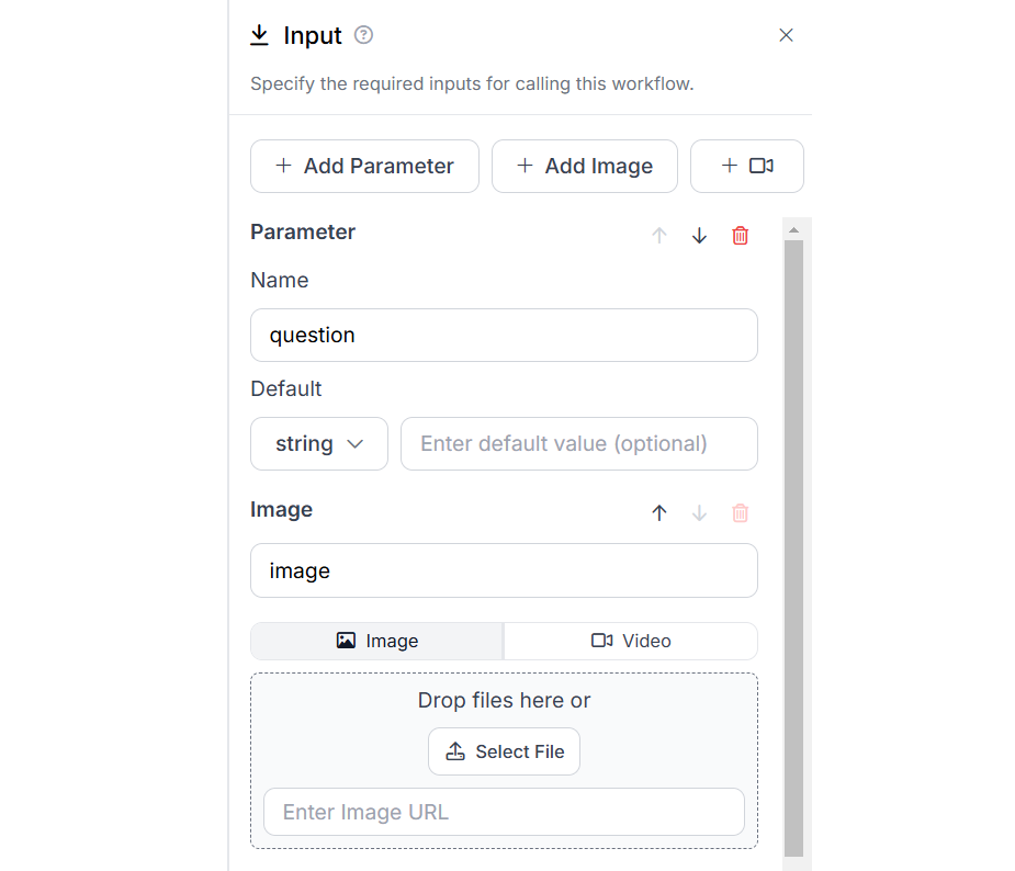 For our example we will create a VAQ Workflow using Llama 3.2 Vision block. First configure the input block with parameter “question” and image input.