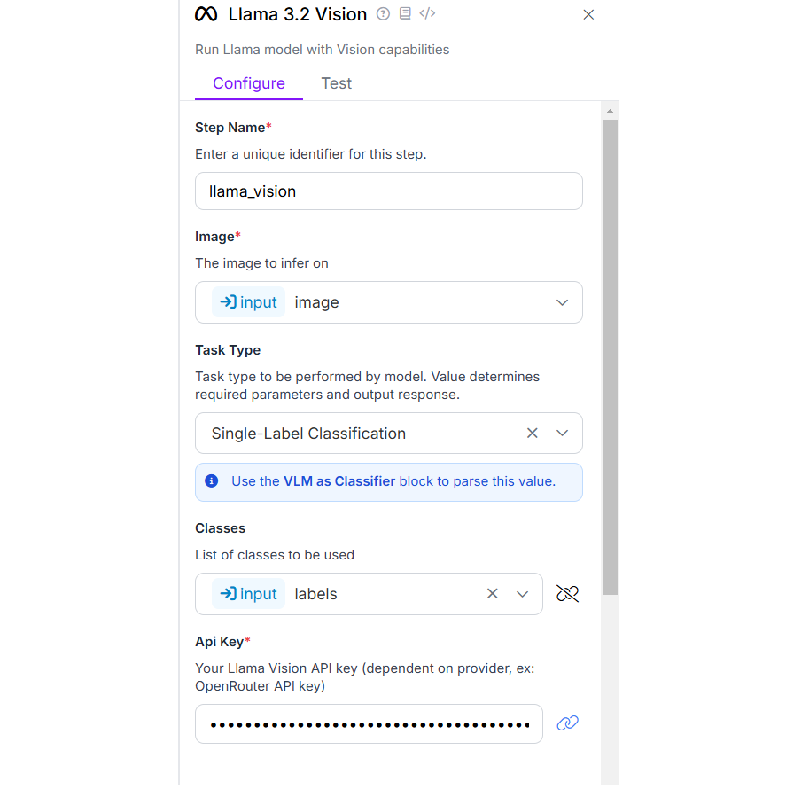 Next you need to configure Llama 3.2 Vision block. In this block specify task type as “Single-Label Classification”, the classes field should be bind with “labels” parameter that we have specified in the input block in above step. Specify you Llama Vision API key obtained from OpenRouter. The Llama 3.2 Vision block must look like following.