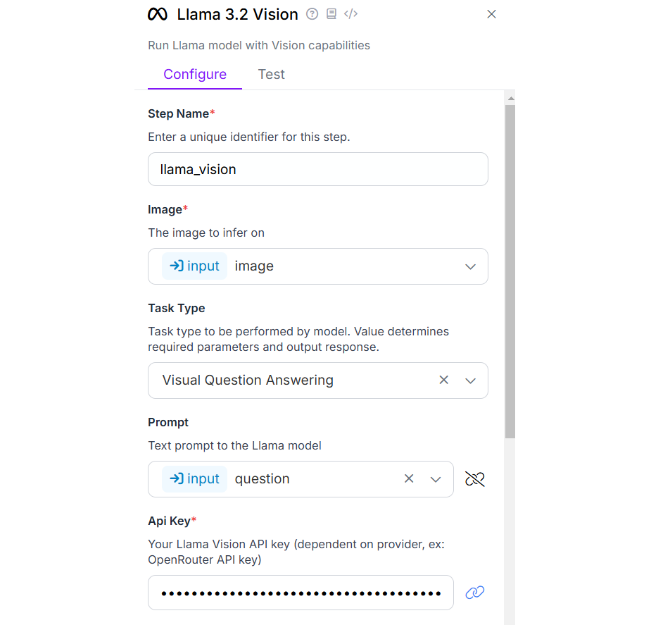 Then add Llama 3.2 Vision block and configure it with task type as “Visual Question Answering” and bind the prompt field with the “question” parameter.
