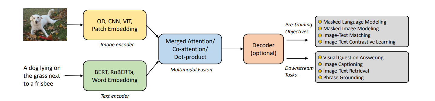Merged Attention: The model looks at the image and the text simultaneously to find correlations.