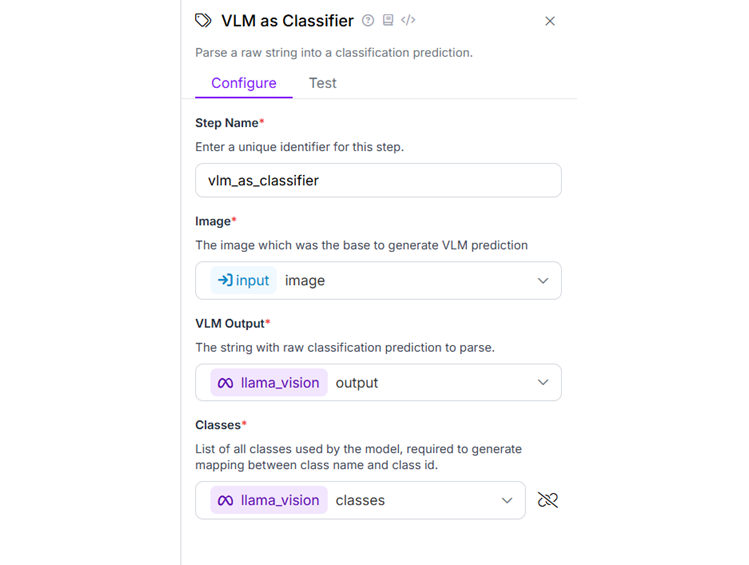 The next block is VLM as Classifier block. This block gets string input from our Llama 3.2 Vision block. Input is then parsed to classification prediction and returned as block output. Following is the configuration for this block.