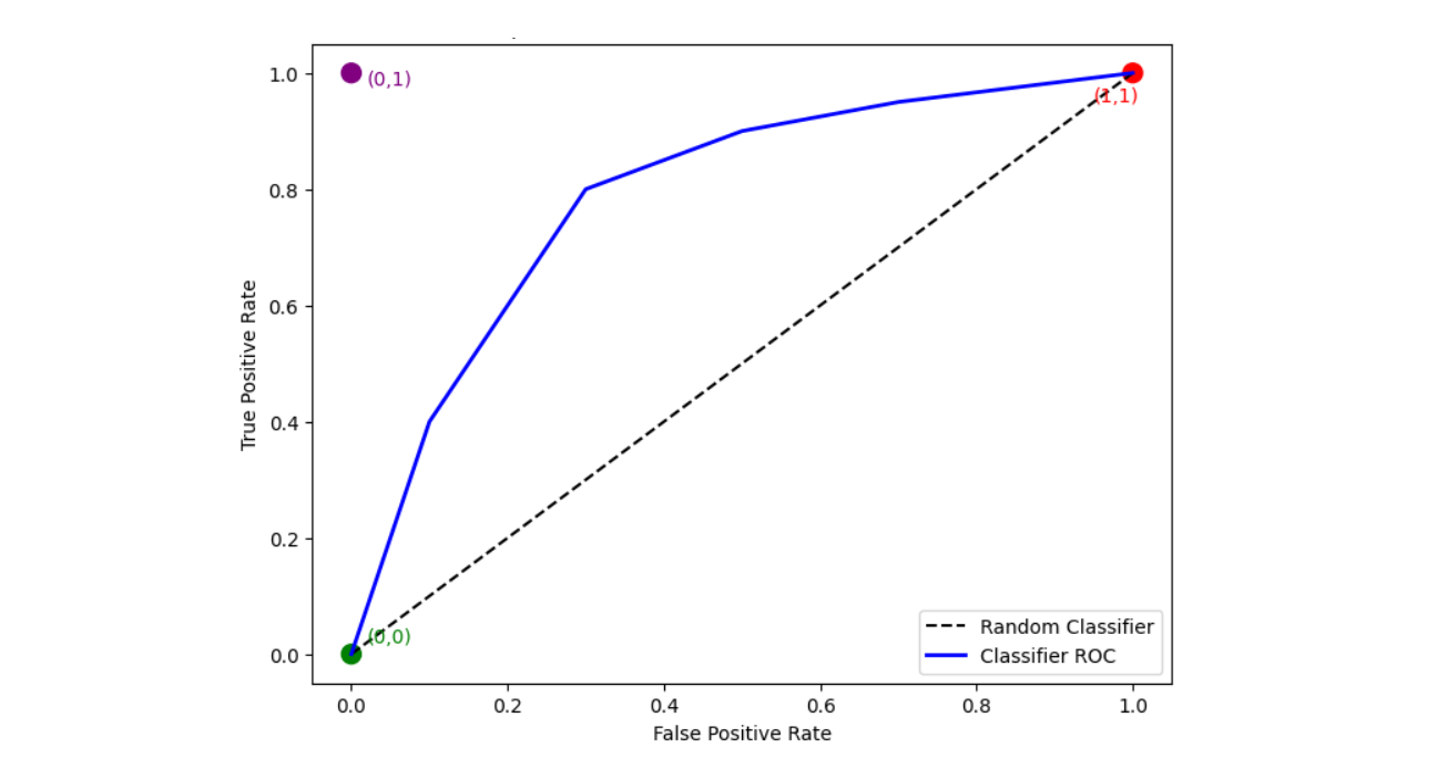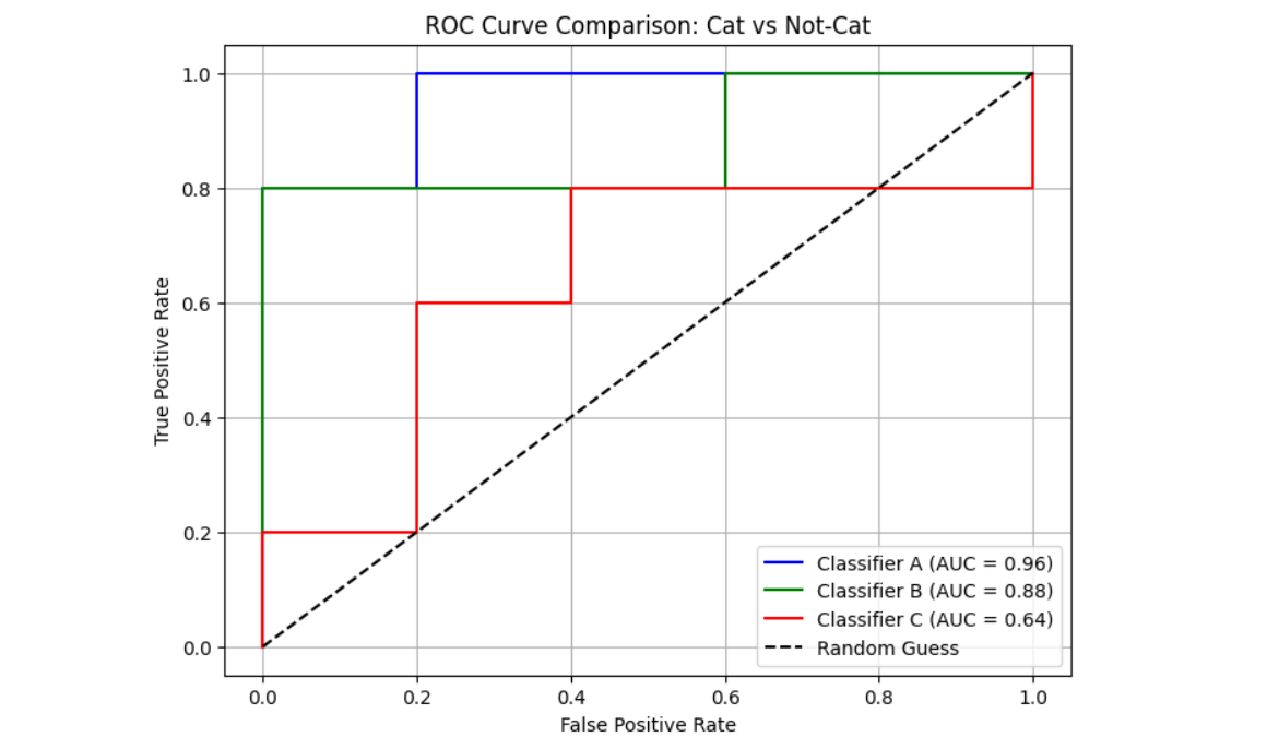 A perfect classifier would reach the top-left corner (True Positive Rate of 1 and False Positive Rate of 0) because it catches all cats without any false alarms. In contrast, a model that’s just guessing randomly would create a diagonal line from (0,0) to (1,1).