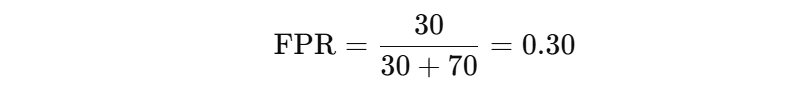 For example, suppose if there are 100 actual negative cases (e.g., not-cat images), and your model mistakenly marks 30 of them as cat then FPR is: