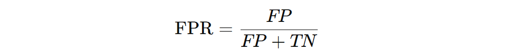 False Positive Rate (FPR): It is the fraction of negatives incorrectly classified as positives. In other words FPR is the proportion of actual negatives that were incorrectly predicted as positive.
