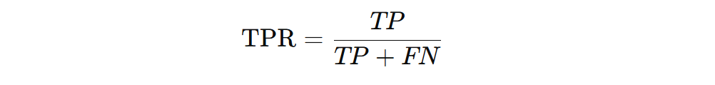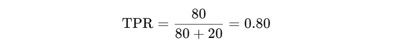 For example suppose if there are 100 actual positive cases (e.g., images of cats), and your model correctly identifies 80 of them as positive then TPR is: