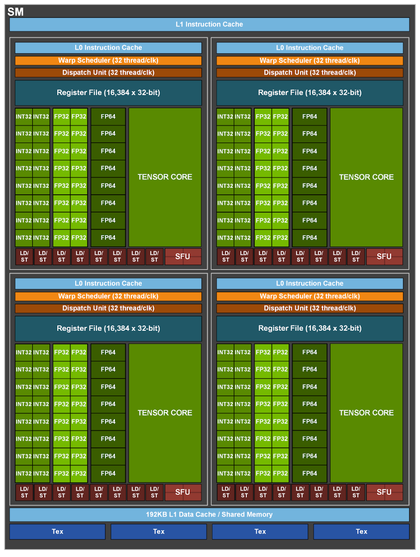 - A collection of CUDA cores, LD/ST units, SFUs, and (in newer architectures) tensor cores.