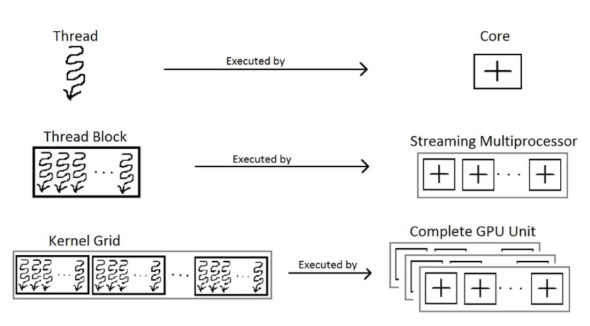 Here’s how the CUDA programming model corresponds to GPU hardware: