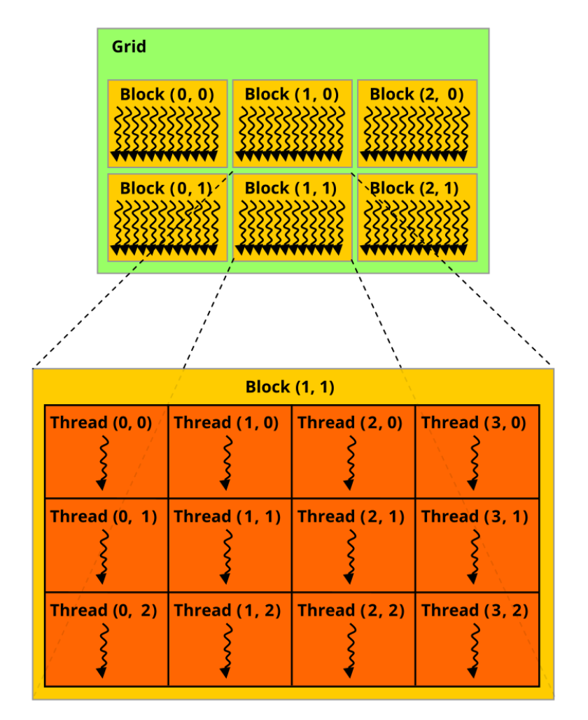 - Grids: Collections of thread blocks. Grids enable CUDA to scale execution across all available SMs on the GPU.