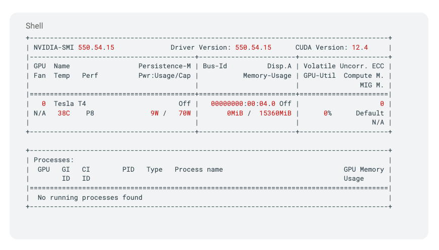 This tells you the driver version, CUDA version, available GPUs, their memory usage, and current processes.