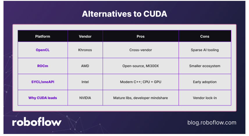 CUDA is powerful, but it comes with a few drawbacks: it is not open source and is tied exclusively to NVIDIA GPUs. Over the years, other vendors and communities have introduced alternatives to address these limitations: