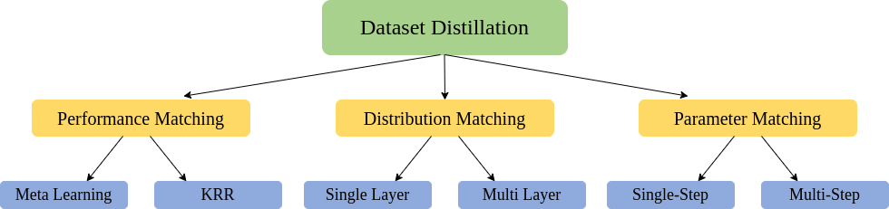 Performance Matching includes methods like Meta-Learning and Kernel Ridge Regression (KRR), which focus on matching the performance of the distilled model with the larger model. Distribution Matching encompasses techniques such as Single Layer and Multi Layer, where the goal is to match the data distribution between the distilled and original datasets. Parameter Matching involves methods like Single-Step and Multi-Step, which aim to match the model parameters between the distilled and larger models.