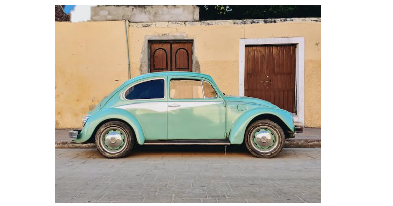 The image shows a vintage Volkswagen Beetle car parked on a cobblestone street in front of a yellow building with two wooden doors. The car is painted in a bright turquoise color and has a sleek, streamlined design. It has two doors on either side of the car, one on top of the other, and a small window on the front. The building appears to be old and dilapidated, with peeling paint and crumbling walls. The sky is blue and there are trees in the background.