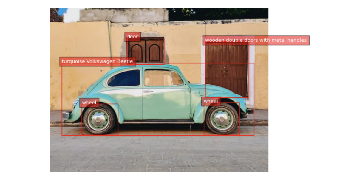Since our model returns bounding boxes, we can programmatically evaluate the image as necessary. For example, we could check if a bounding box was in front of another one (i.e. if a car was parked in front of a door), check if two bounding boxes are side-by-side, and perform other checks that involve analyzing the relations of grounded regions in an image.