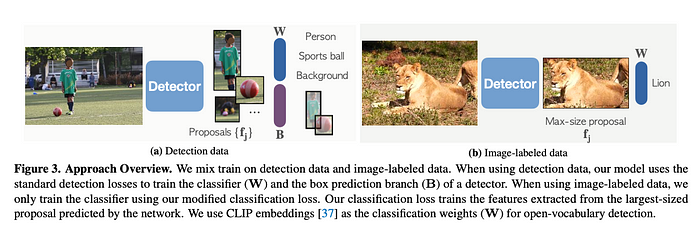 Detic leverages Semi-supervised WSOD using the ImageNet-21K dataset, which is conventionally employed for object detection purposes, to train the Detic model detector. Notably, unlike previous studies, Detic does not provide class labels for the resulting bounding boxes generated by the object detector. Instead, it adopts a different approach.