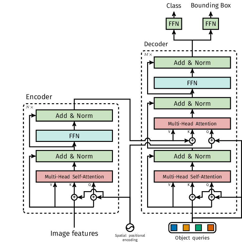 - Transformer Self-Attention: the transformer's self-attention mechanism is applied to the object queries and the spatial features (known as keys and values) extracted from the input image. This self-attention mechanism allows DETR to learn complex relationships and dependencies between objects and their spatial locations.
