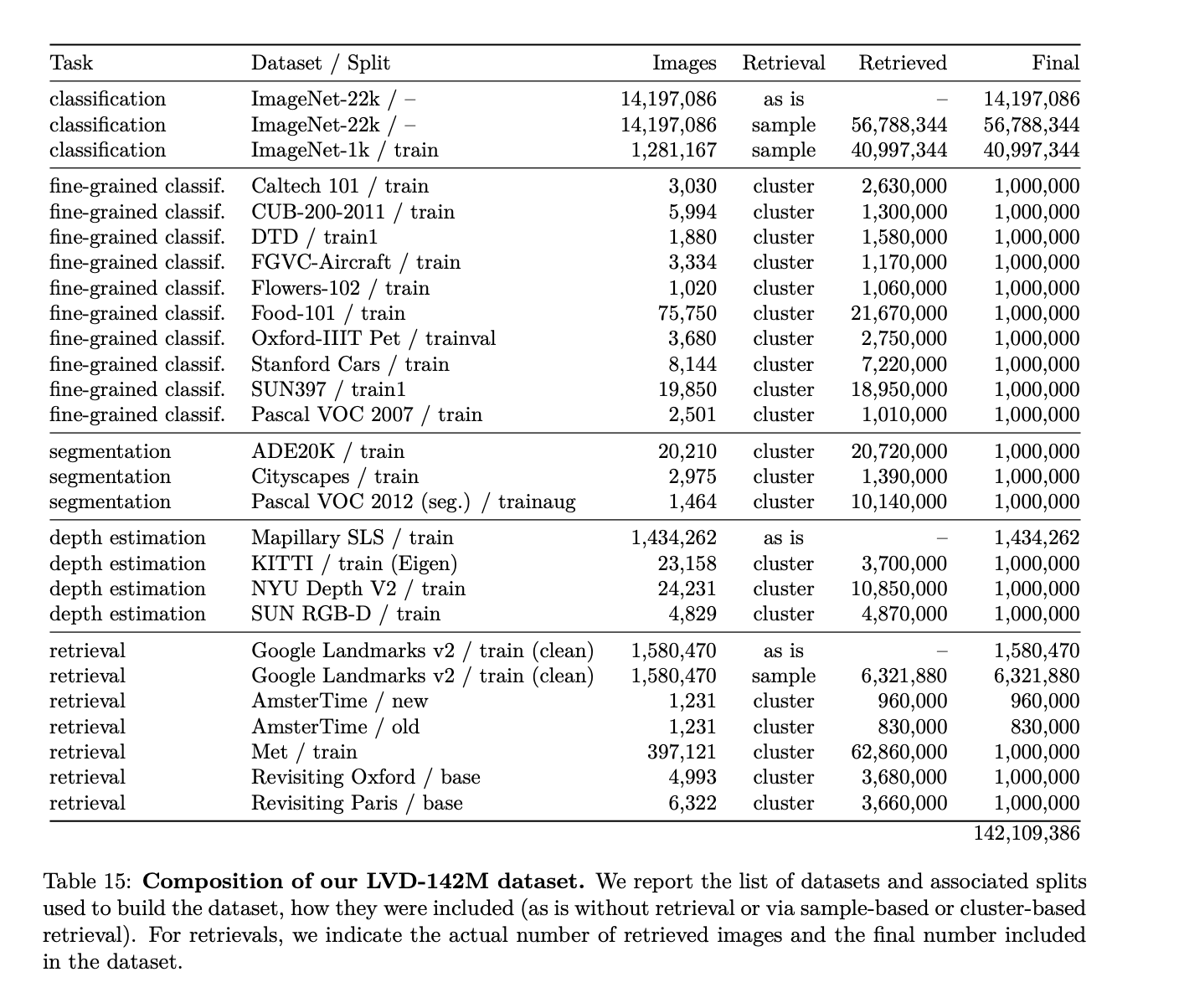 CLIP learned semantic information about the contents of images based on the text pairs. DINOv2, in contrast, was trained on 142,109,386 images. The table below, featured in the DINOv2 paper, shows how the data was sourced for the dataset: