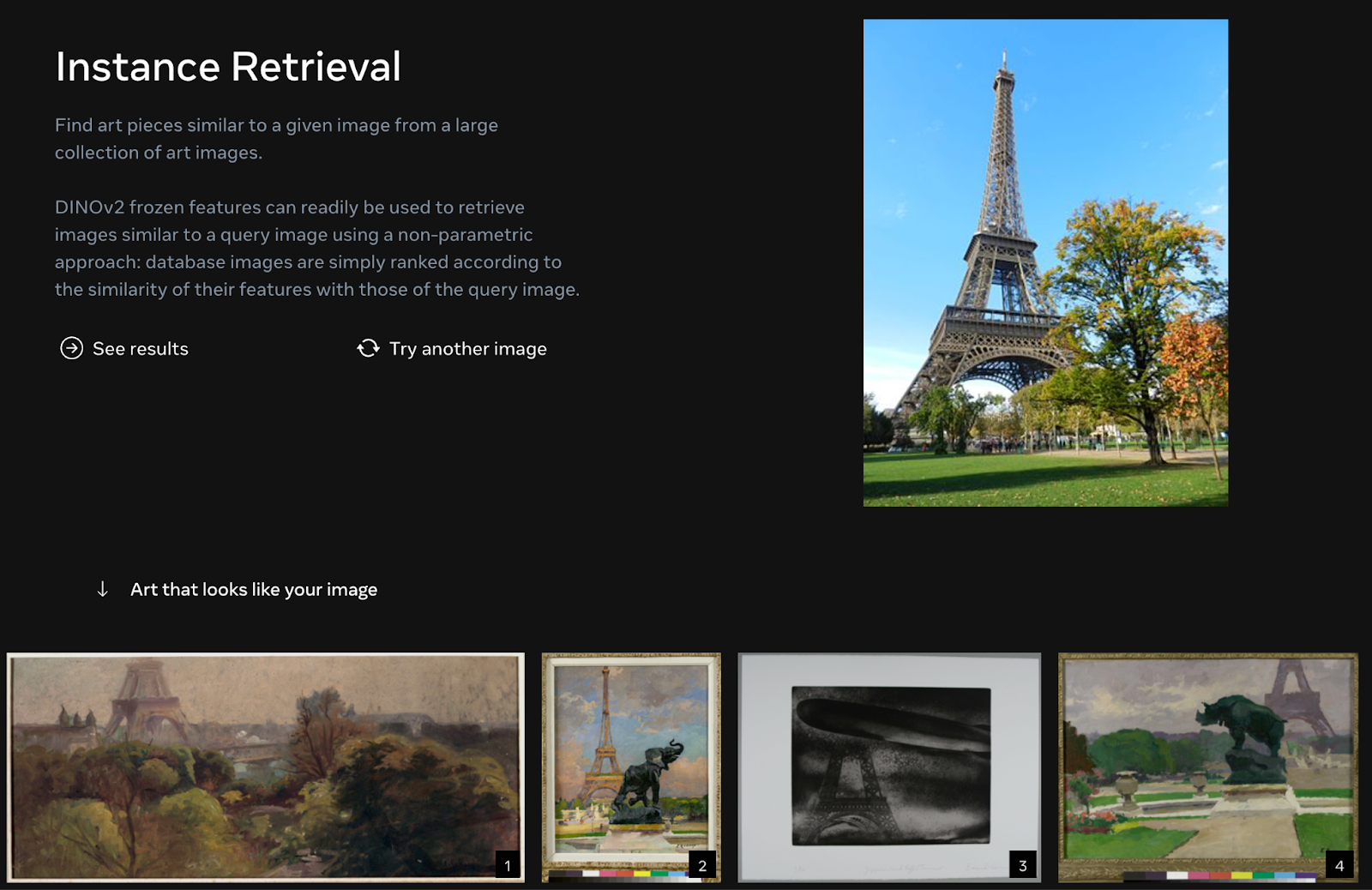 In the Meta Research playground accompanying DINOv2, there is a system that retrieves images related to landmarks. This is used to find art pieces that are similar to an image.