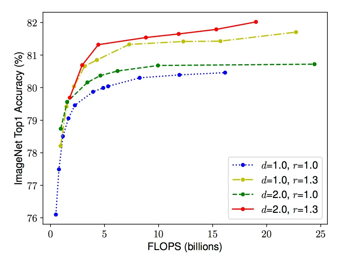 Scaling Network Width for Different Baseline Networks. Each dot in a line denotes a model with a different width coefficient (w). The first baseline network (d=1.0, r=1.0) has 18 convolutional layers with a resolution of 224x224, while the last baseline (d=2.0, r=1.3) has 36 layers with a resolution of 299x299. Source