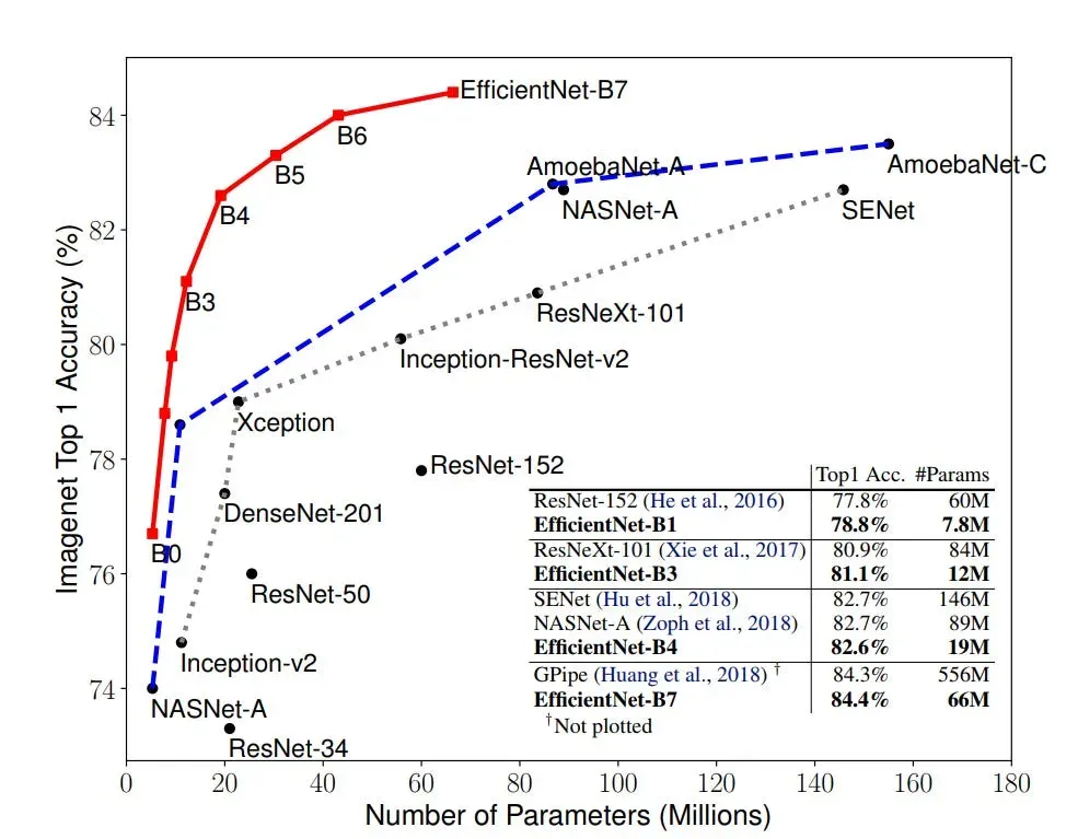 The figure above depicts the EfficientNet curve highlighted by a red line. On the horizontal axis lies the model size, while the vertical axis represents the accuracy rate. A mere glance at this illustration is enough to underscore the prowess of EfficientNet. In terms of accuracy, EfficientNet outshines its predecessors by a mere 0.1%, edging slightly past the former state-of-the-art model, GPipe.