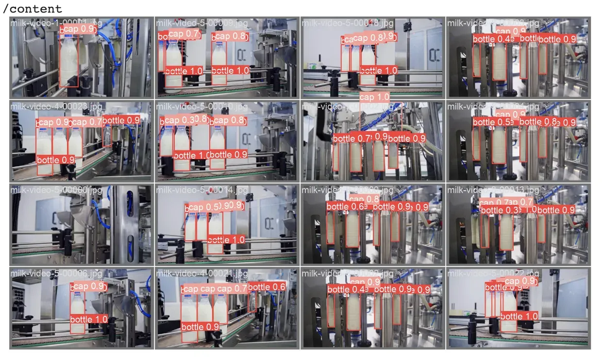 With deep learning techniques, you can train a model to identify exact properties in an image. For example, you can train a milk bottle detection model to identify bottles and bottle caps. Then, you can write logic that records unexpected behavior, such as when there is no cap in the region of a bottle after the capping process has completed.