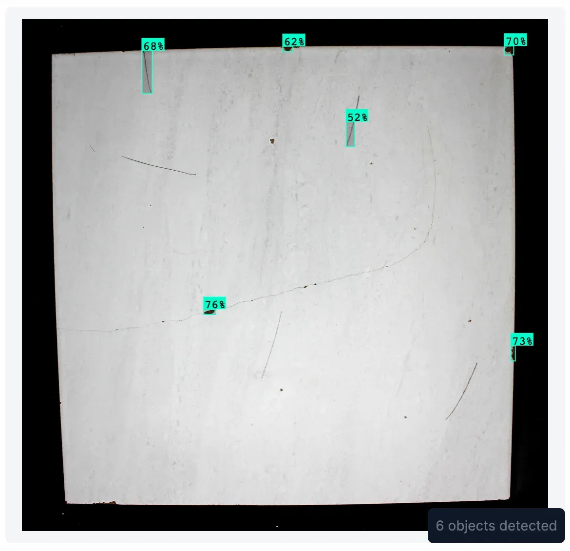 In the image below, every chip in a piece of ceramic material is highlighted with a blue box and a confidence level. The confidence level indicates the likelihood that a crack is present.