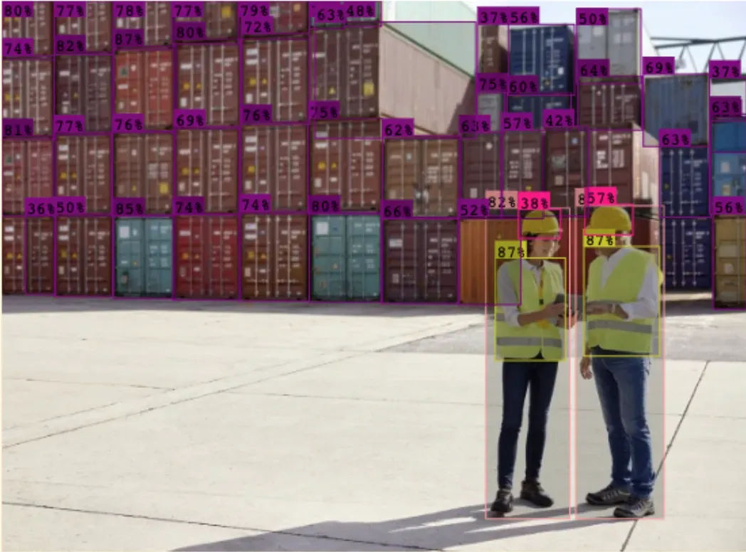 In this image, different objects have been identified using a fine-tuned logistics computer vision model. A "fine-tuned model" is a system that has been trained to identify different objects. In the example above, we used a logistics model. This model has been trained to recognize 20 different objects, from helmets to shipping containers to people.