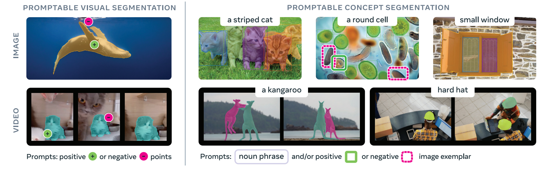 | PCS | Detects, segments & tracks all instances of a prompted concept | Open vocabulary | Text / Exemplar Image prompts | Yes |