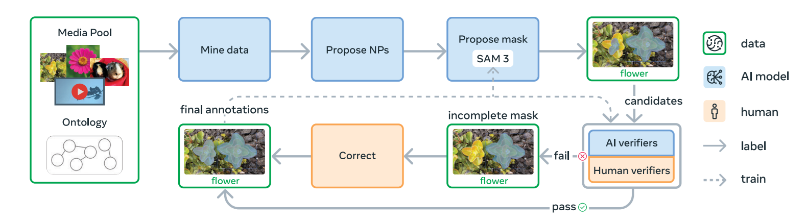 The data engine continuously improves itself through a cycle of AI proposals, human feedback and model retraining. Over four phases, it scales up in both complexity and automation, allowing SA-Co to grow in size, variety and quality. By combining captioning models, Llama-based AI verifiers and multiple generations of SAM, the engine produces the massive open-vocabulary dataset needed to train SAM 3.