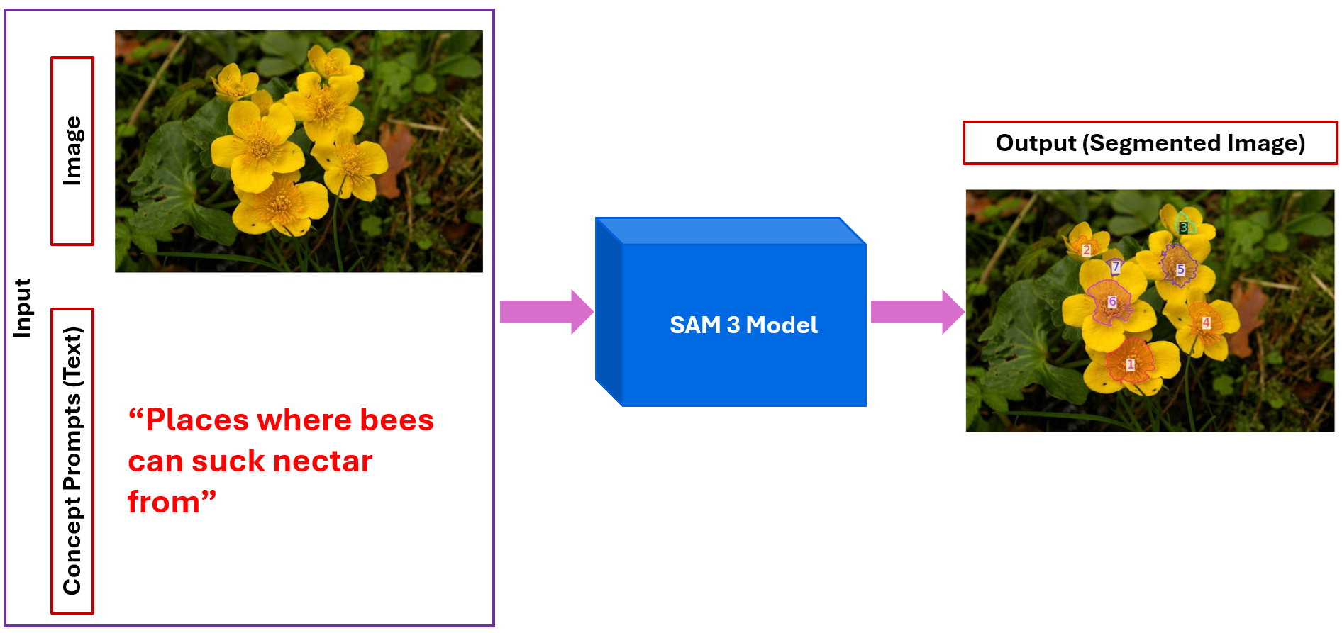 The image shows how SAM 3 uses a natural-language prompt to segment concepts in an image. The user provides the text “Places where bees can suck nectar from,” and SAM 3 identifies and segments all flower centers that match this description. The output highlights each instance separately, demonstrating prompt-controlled, open-vocabulary segmentation. This article explores:
