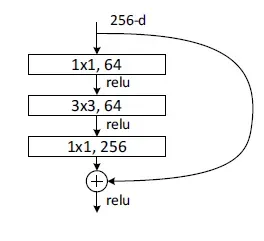 The residual block used in ResNet-50 is called the Bottleneck Residual Block. This block it has the following architecture: