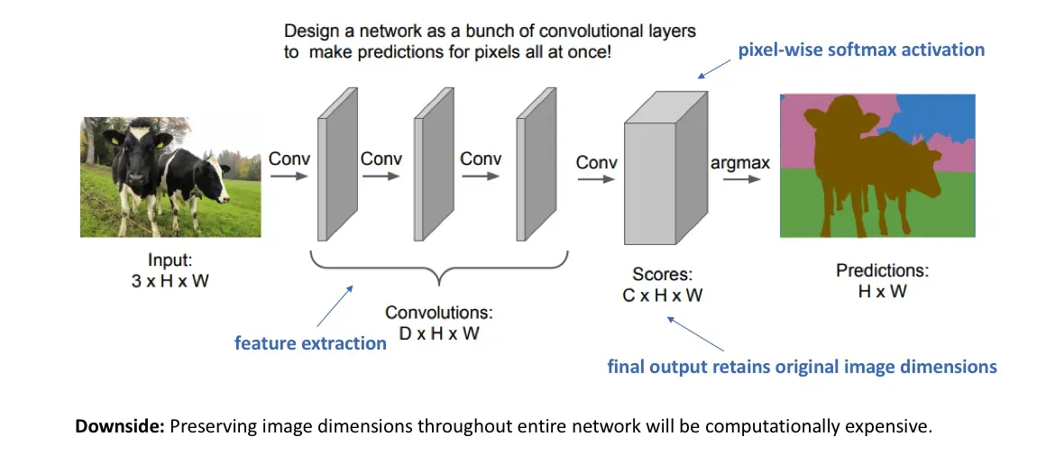 After defining the task's structure, we need to define an architecture tailored for this purpose. A straightforward method for constructing a neural network architecture for this task involves stacking multiple convolutional layers (employing the same padding to maintain dimensions) and generating a final segmentation map. This approach directly learns the mapping from the input image to its respective segmentation by progressively transforming feature mappings.