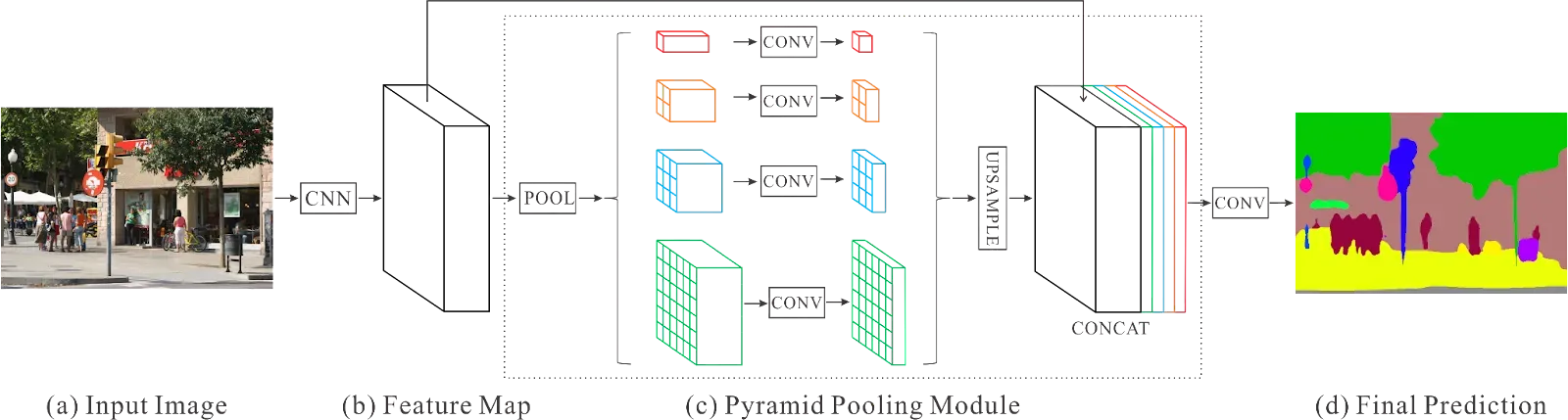 The network begins with a deep convolutional backbone, such as ResNet or VGGNet, which extracts rich feature representations from the input image. These features are then passed through a series of pyramid pooling modules, each operating at a different spatial scale, to capture contextual information at various levels of granularity.