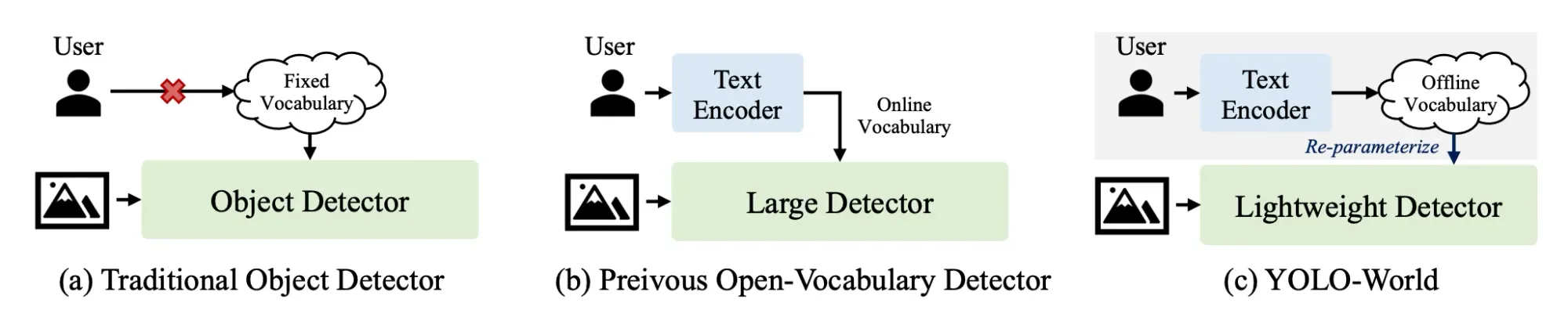 Unlike traditional methods, which rely on a fixed set of predefined categories, or earlier open-vocabulary approaches that encode user prompts in real-time (online vocabulary), YOLO-World introduces a more efficient alternative.