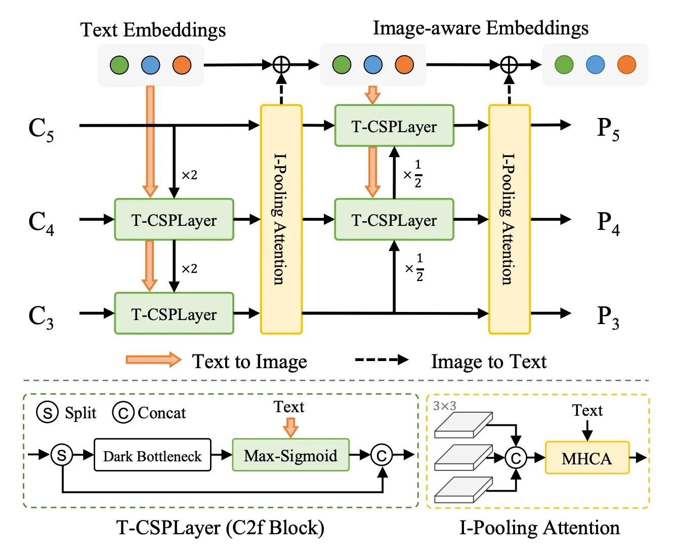 - Text-guided Cross Stage Partial Layer (T-CSPLayer): Built on top of the C2f layer, used in the YOLOv8 architecture, by adding text guidance into multi-scale image features. This is achieved through the Max Sigmoid Attention Block, which computes attention weights based on the interaction between text guidance and spatial features of the image. These weights are then applied to modulate the feature maps, enabling the network to focus more on areas relevant to the text descriptions.