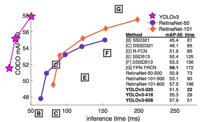 YOLOv3 demonstrates comparable performance to other leading object detectors like RetinaNet, while also boasting significantly faster speeds according to the COCO mAP 50 benchmark. Additionally, it outperforms SSD and its variants.