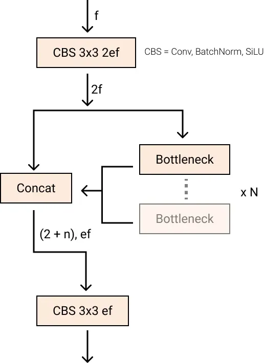 The stem's first 6x6 conv is replaced by a 3x3, the main building block was changed, and C2f replaced C3 . The module is summarized in the picture below, where "f" is the number of features, "e" is the expansion rate and CBS is a block composed of a Conv, a BatchNorm and a SiLU later.