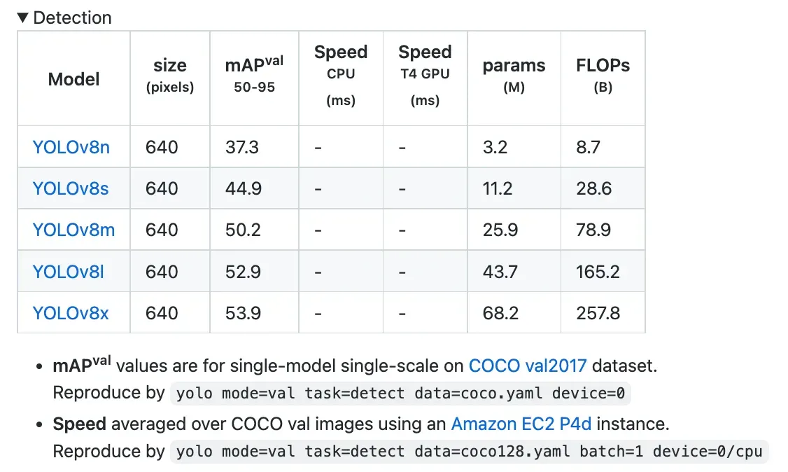 YOLOv8 has five versions as of its release on January 10th, 2023, ranging from YOLOv8n (the smallest model, with a 37.3 mAP score on COCO) to YOLOv8x (the largest model, scoring a 53.9 mAP score on COCO).