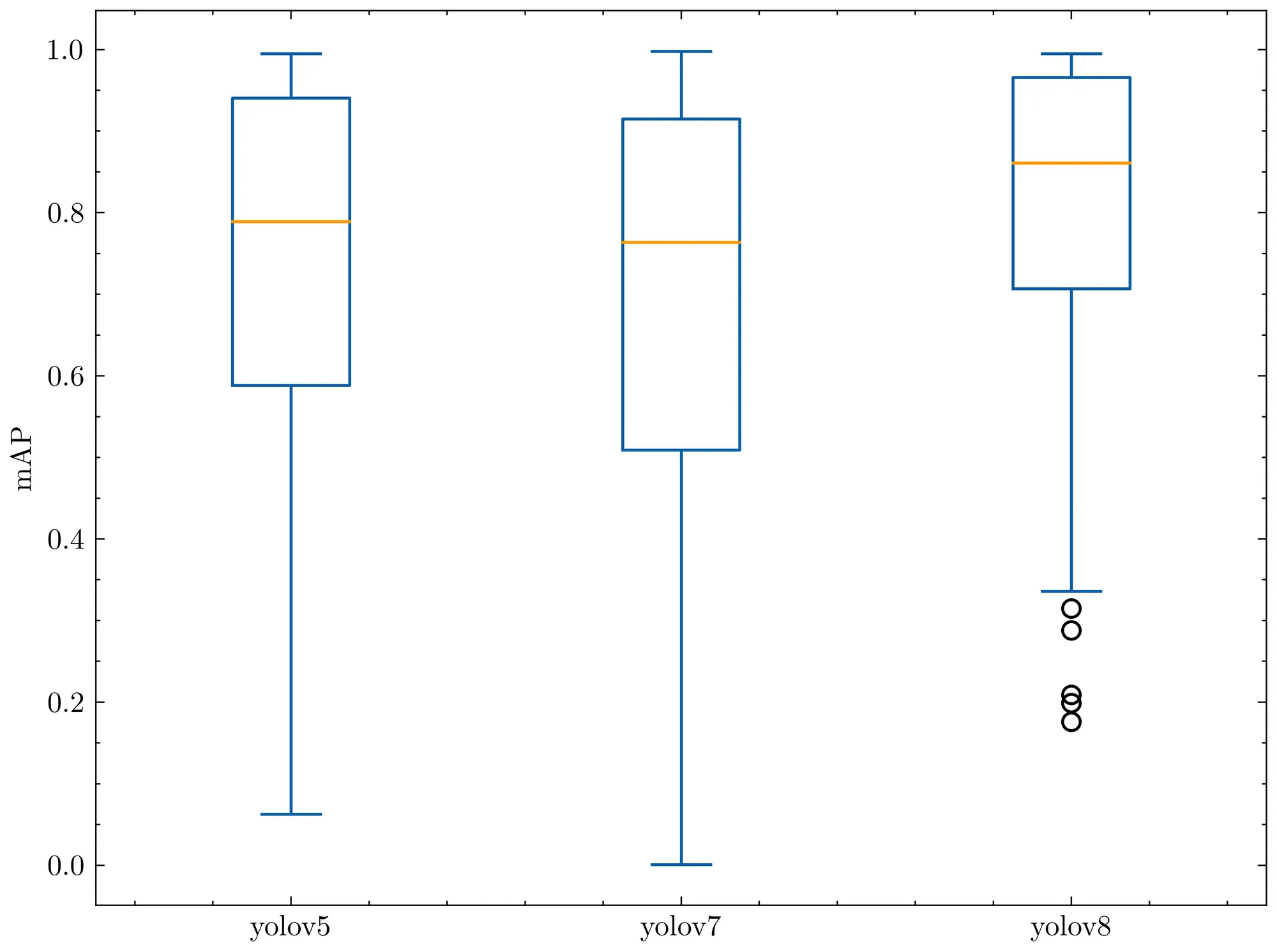 We evaluated YOLOv8 on our RF100 benchmark alongside YOLOv5 and YOLOv7, the following box plots show each model's mAP@.50.