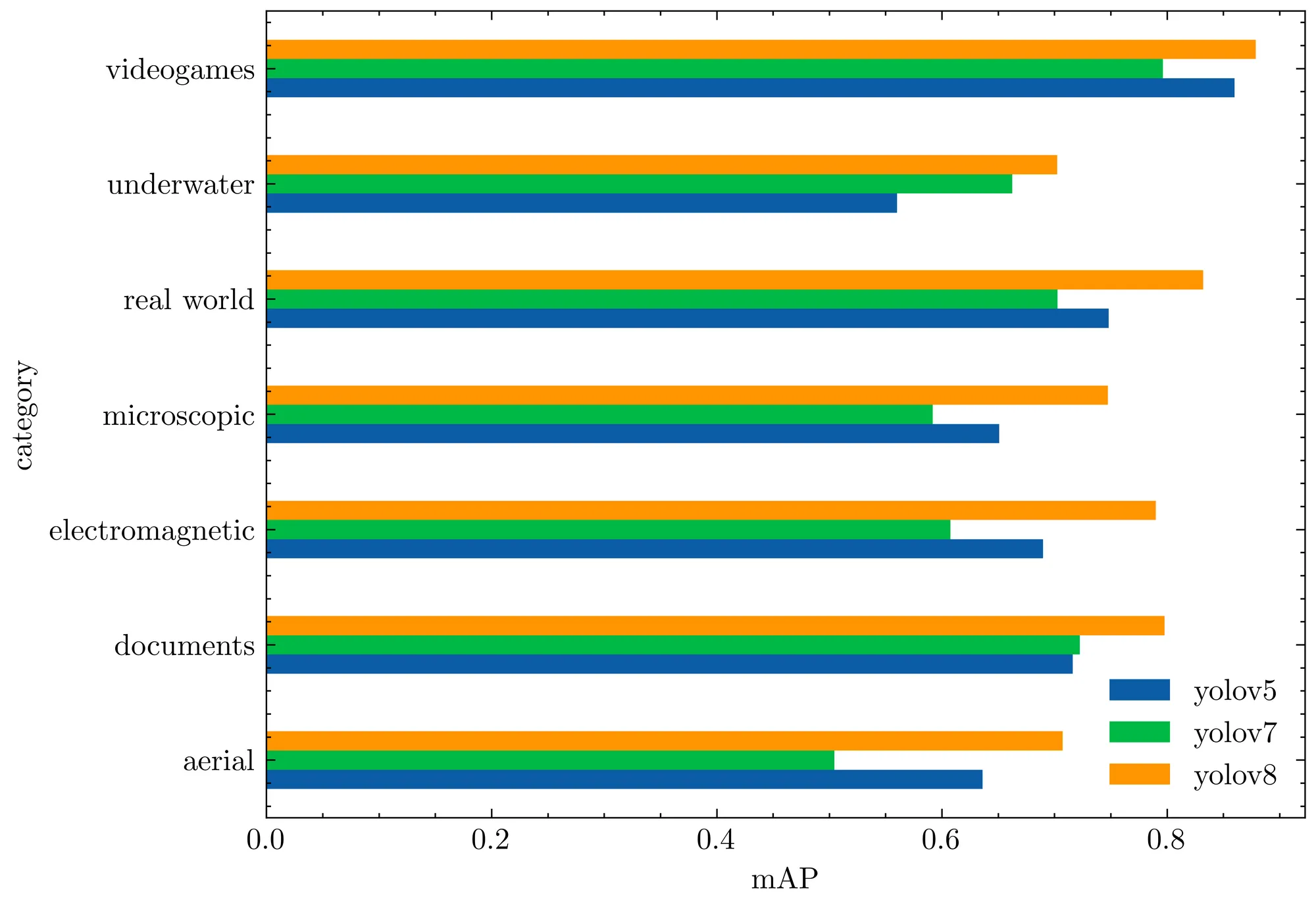 The following bar plot shows the average mAP@.50 for each RF100 category. Again, YOLOv8 outperforms all previous models.