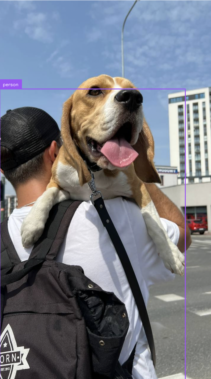 The model successfully detected a person in the image, indicated by the purple bounding box on the image.