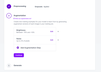 For the Augmentation step, I added both Brightness and Noise. While the images from the show should be consistent, it might be useful to account for some varying brightness and a little bit of noise. For brightness, I used values of -15% to +15%. For noise, I used a value of 2%. With those settings configured, hit Generate to create the dataset.