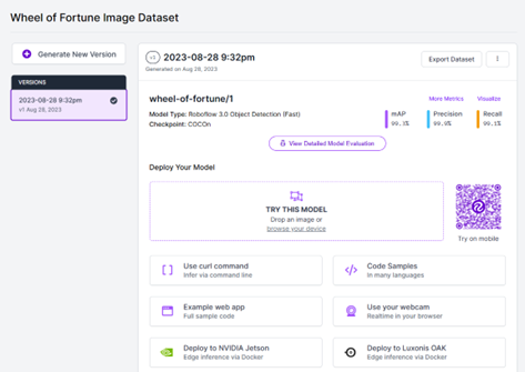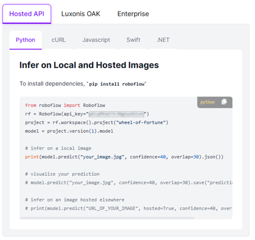 Now go to the Deploy section in your Roboflow project. I am going to cover deployment in detail but want to point out a key section here. In the instructions for deployment section, you will see example code snippets. Remember this for later, we will need some of the information from here. Copy the Python example and save it for use later.