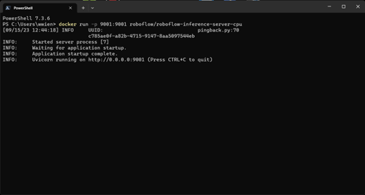 Installing Docker is beyond the scope of this article, but there are plenty of good tutorials on YouTube that will help you get Docker running on your system. You can also reference the official Docker documentation for more information. I use Windows, so will provide some instructions here on how to obtain and run the Roboflow inference image. The first step is to retrieve the Docker image that we need. From a command line run: