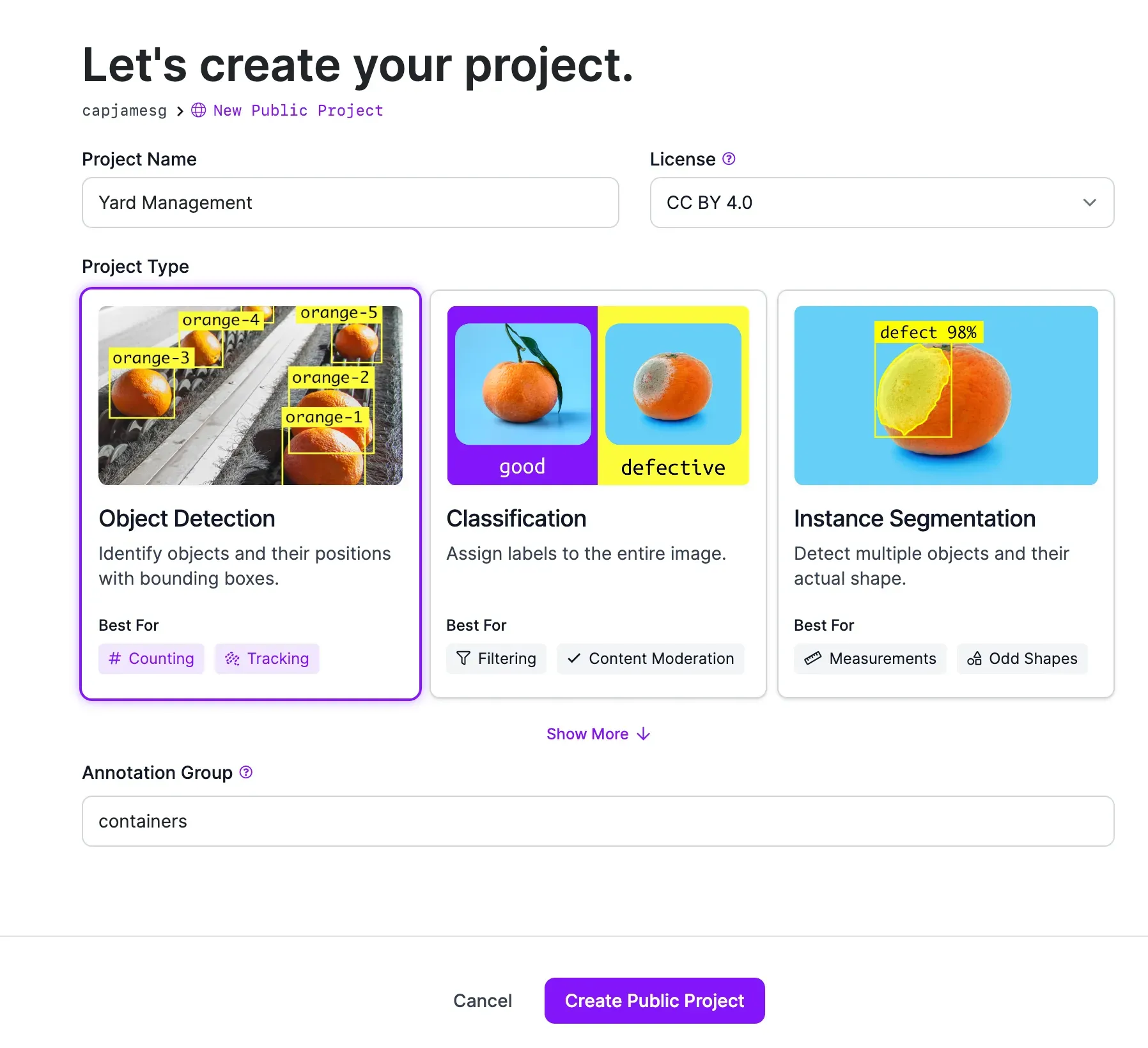 You will be taken to a page with a few fields to fill out. When asked to choose a task type, select “Object Detection”. Choose a name for your project. Training data is open source for Public plans or you can sign up for a paid Roboflow plan to store images privately.