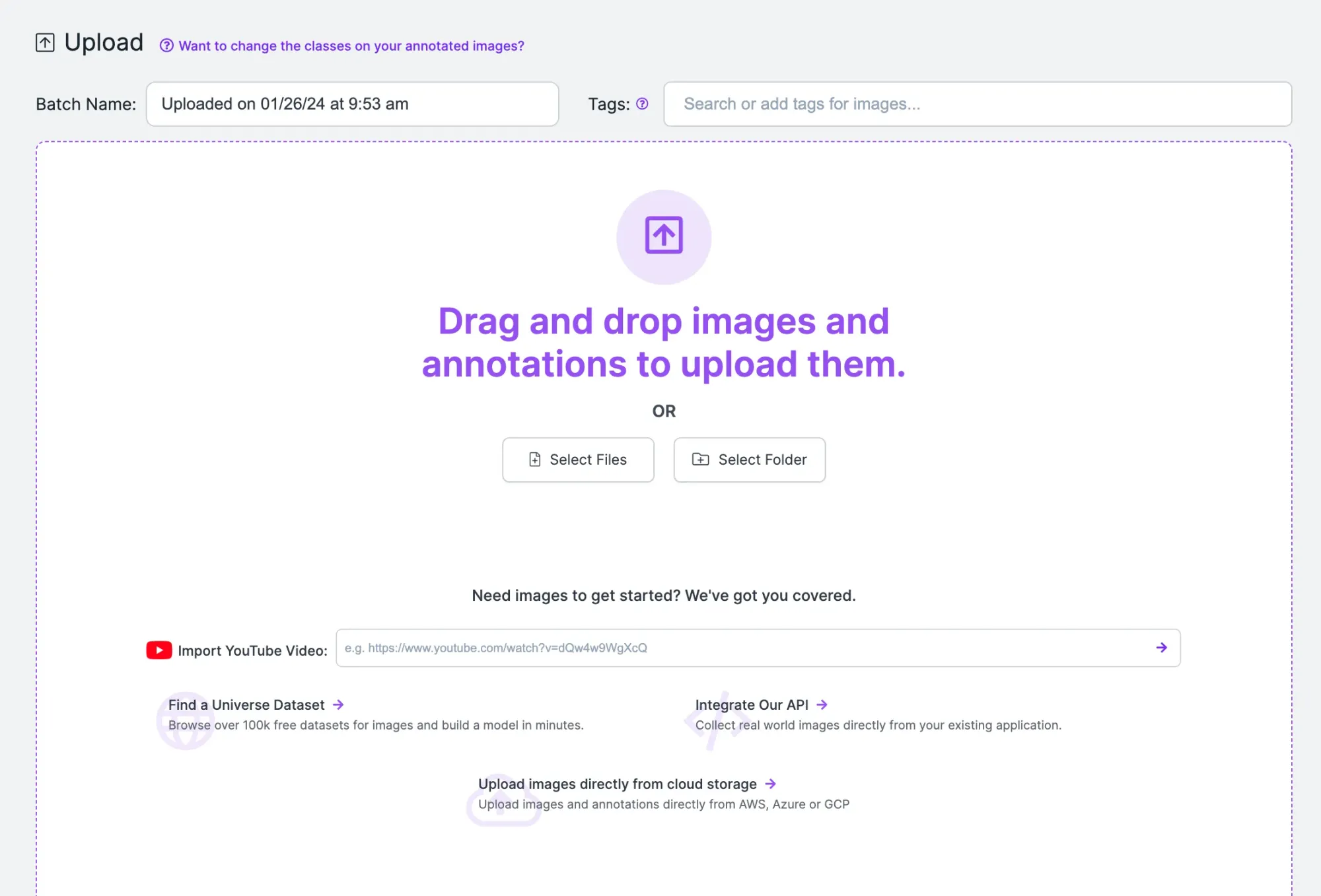 You will be redirected to a page where you can upload images you want to label. Drag your images into the box on the web page to upload them to your project. When the images have been processed, click “Save and Continue” to complete the upload process.