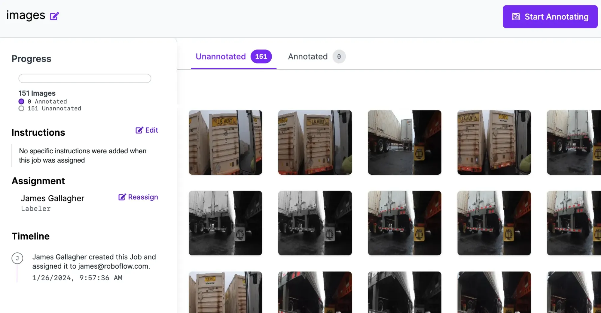 After uploading your data, you will be taken to a page where you can assign images to colleagues to label. With images in Roboflow, you can start labeling data.