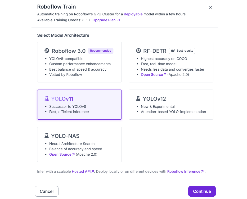 Roboflow uses best-practice settings (including YOLO) to train in the background. Once trained, the model is available on Roboflow inference server.