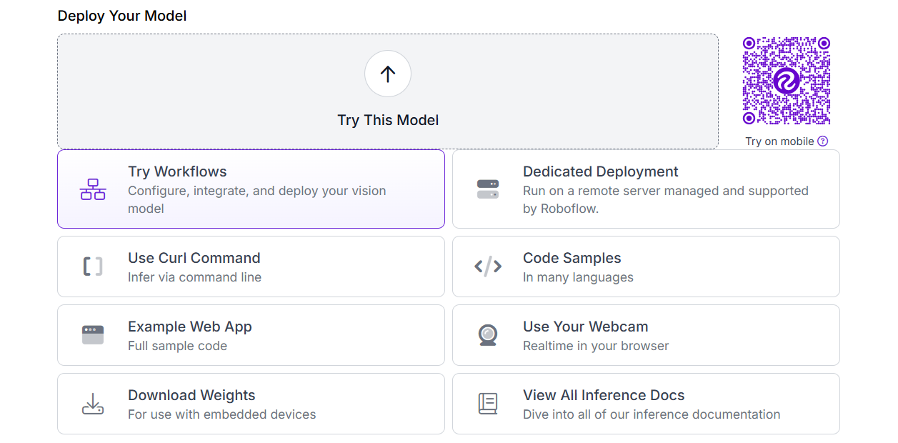 Roboflow offers different deployment options. You can deploy the custom trained model using inference API or download weights.