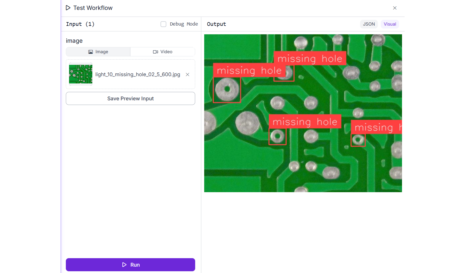Roboflow Workflows is a powerful tool that enables you to quickly build and deploy computer vision applications. It offers access to pre-trained YOLO models that you can use out of the box, as well as the flexibility to integrate your own custom-trained or fine-tuned YOLO models with the same simplicity. In this example, we’ll create a Workflows application using our YOLOv11 model, trained specifically to detect PCB holes.